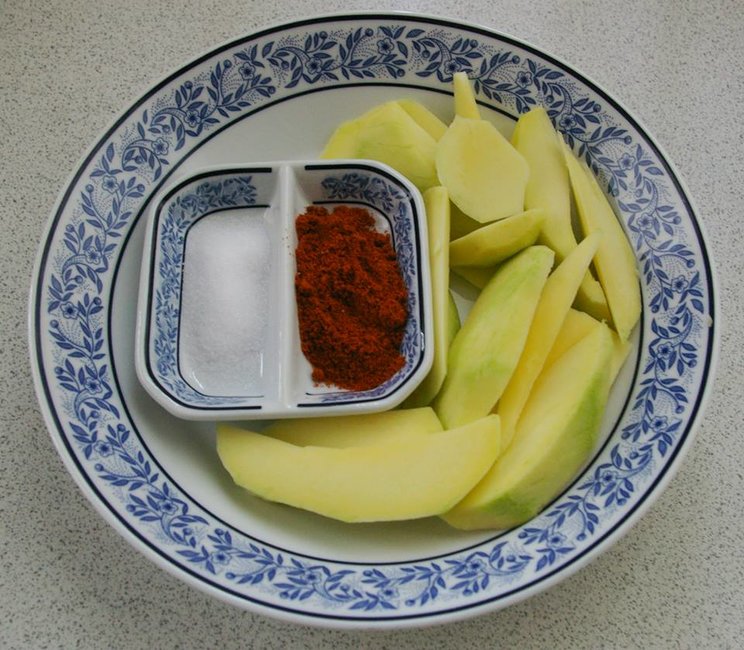 This is a mildly spicy recipe that my whole family loves.Ingredients | Sliced Green Mango With Chili Powder And Salt2 pounds round steak1 teaspoon meat tenderizer1 onion, chopped2 cloves garlic, minced2 tablespoons distilled white vinegar2 tablespoons vegetable oil2 tablespoons Worcestershire sauce2 teaspoons chili powder1 (8 ounce) can tomato sauce1 lemon, sliced2 tablespoons brown sugar½ teaspoon mustard powder¼ teaspoon hot pepper sauceDirectionsSprinkle meat with meat tenderizer. Place in a shallow glass baking dish large enough to accommodate the meat. Mix together onion, garlic, vinegar, oil, Worcestershire sauce, and chili powder, and pour over steak. Marinate for 2 or more hours in the refrigerator.Preheat grill for medium-low heat.Brush grate with oil. Transfer steak to grill, reserving marinade. Cook, covered, for 30 to 40 minutes, or to your desired degree of doneness, turning once. Allow steak to rest for a few minutes off the heat.While meat is cooking prepare sauce. Combine reserved marinade, tomato sauce, lemon slices, brown sugar, mustard powder, and hot sauce in a medium saucepan. Simmer for 10 minutes over medium low heat.Slice meat across the grain. Spoon sauce over steak, and serve.Info | Sliced Green Mango With Chili Powder And Saltprep: 20 mins cook: 45 mins additional: 2 hrs total: 3 hrs 5 mins Servings: 6 Yield: 6 servings